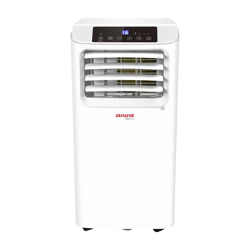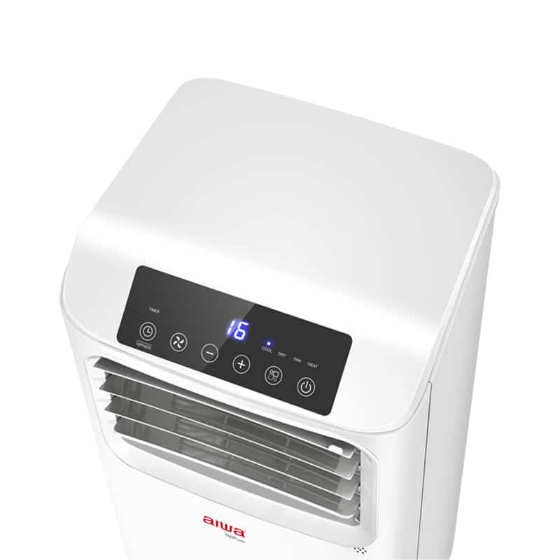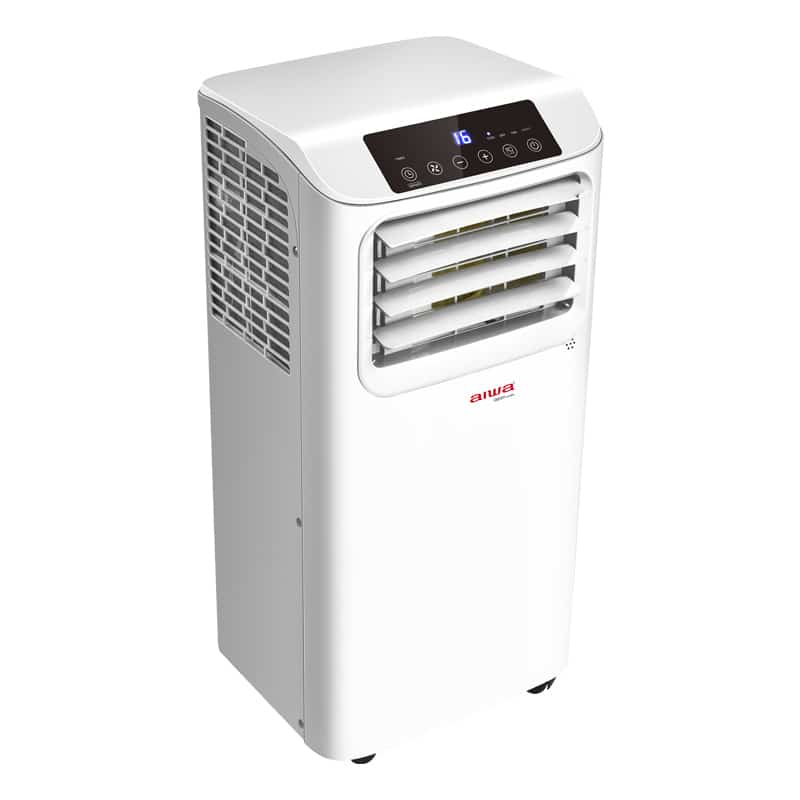 מזגן נייד איכותי מבית aiwa Japan מאז 1951, בעיצוב מודרני וקומפקטי מאפשר קירור יעיל ונוח בכל חלל עם לוח בקרה דיגיטלי, שלט רחוק ותכונות חכמות לשימוש יומיומי